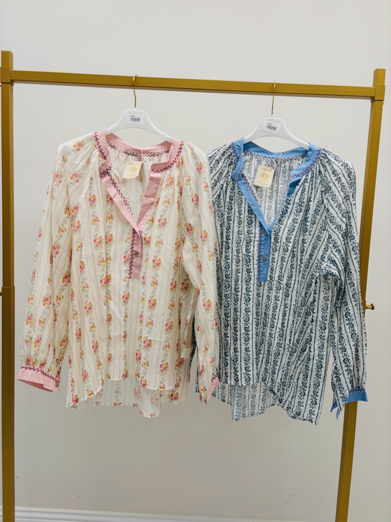 Son col ouvert subtilement travaillé apporte une touche élégante et légère, tandis que les manches longues légèrement bouffantes renforcent l’esprit bohème de la pièce. Les finitions contrastées au col et aux poignets soulignent le motif liberty et ajoutent un détail raffiné qui fait toute la différence.