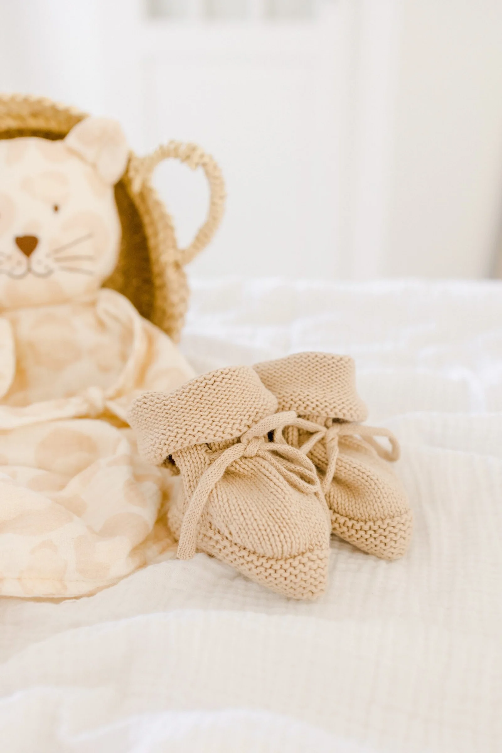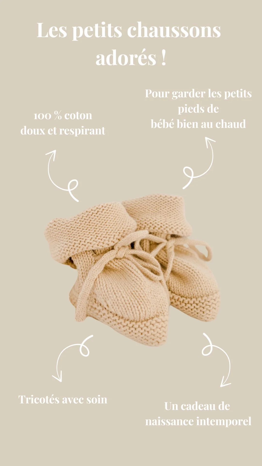 Chaussons de naissance tricotés taupe 100% coton 0-6 mois BIENVENUE AU MONDE