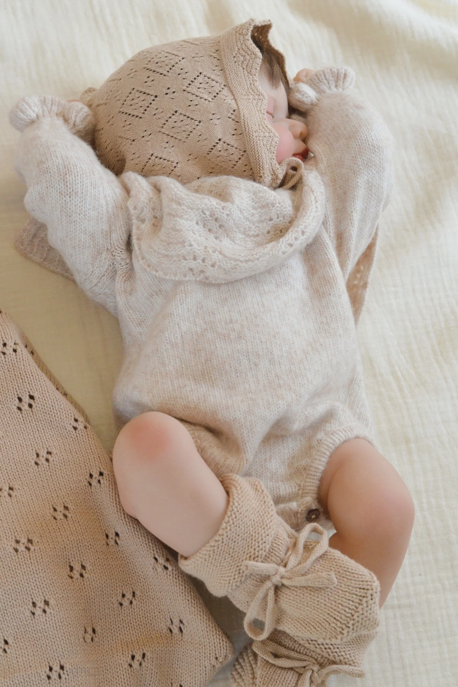 Grande couverture bébé tricotée taupe 100% coton BIENVENUE AU MONDE