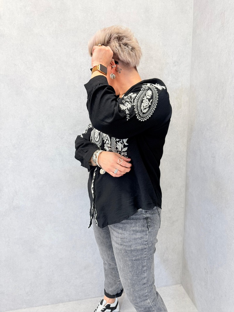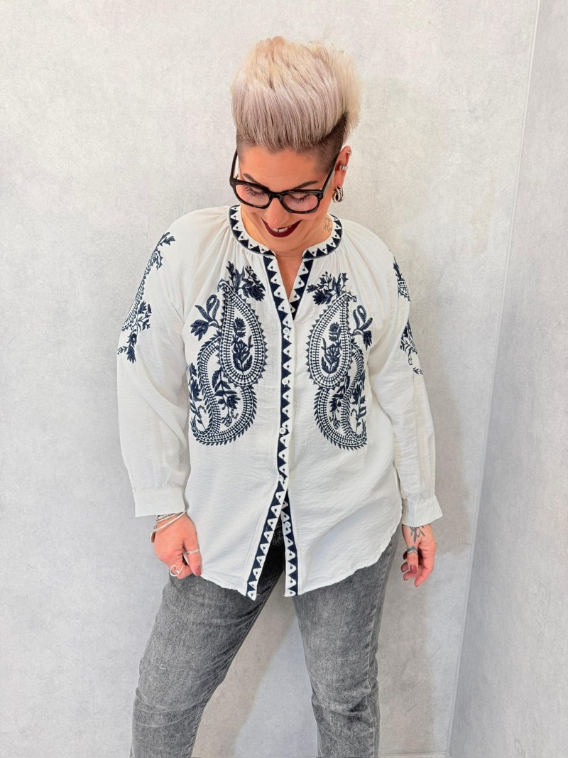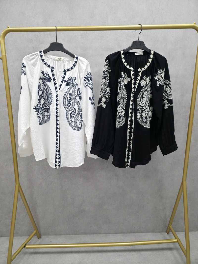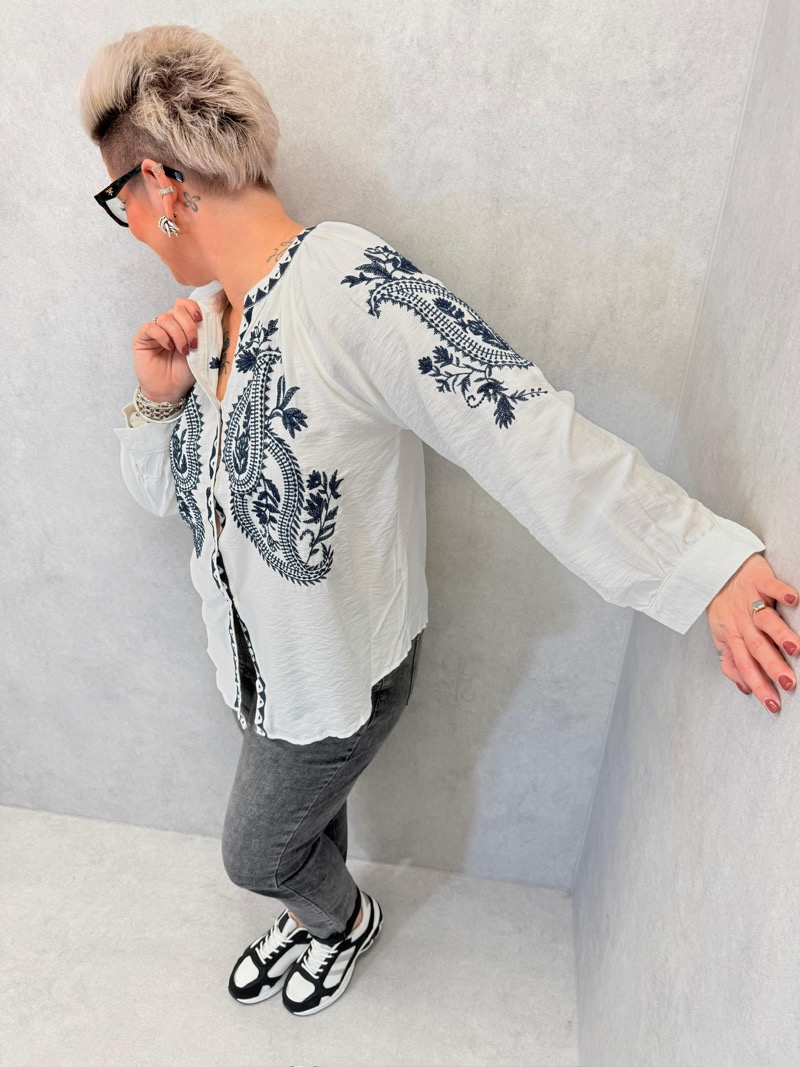 À porter avec un jean, un pantalon fluide ou un pantalon droit pour un look bohème chic très facile à adopter. Elle se marie parfaitement avec des baskets, des sandales ou des boots selon la saison. Pour une allure plus élégante, on peut l’associer à des accessoires sobres et laisser la broderie faire tout le travail. Une chemise idéale pour les clientes recherchant une pièce à la fois confortable, stylée et valorisante.