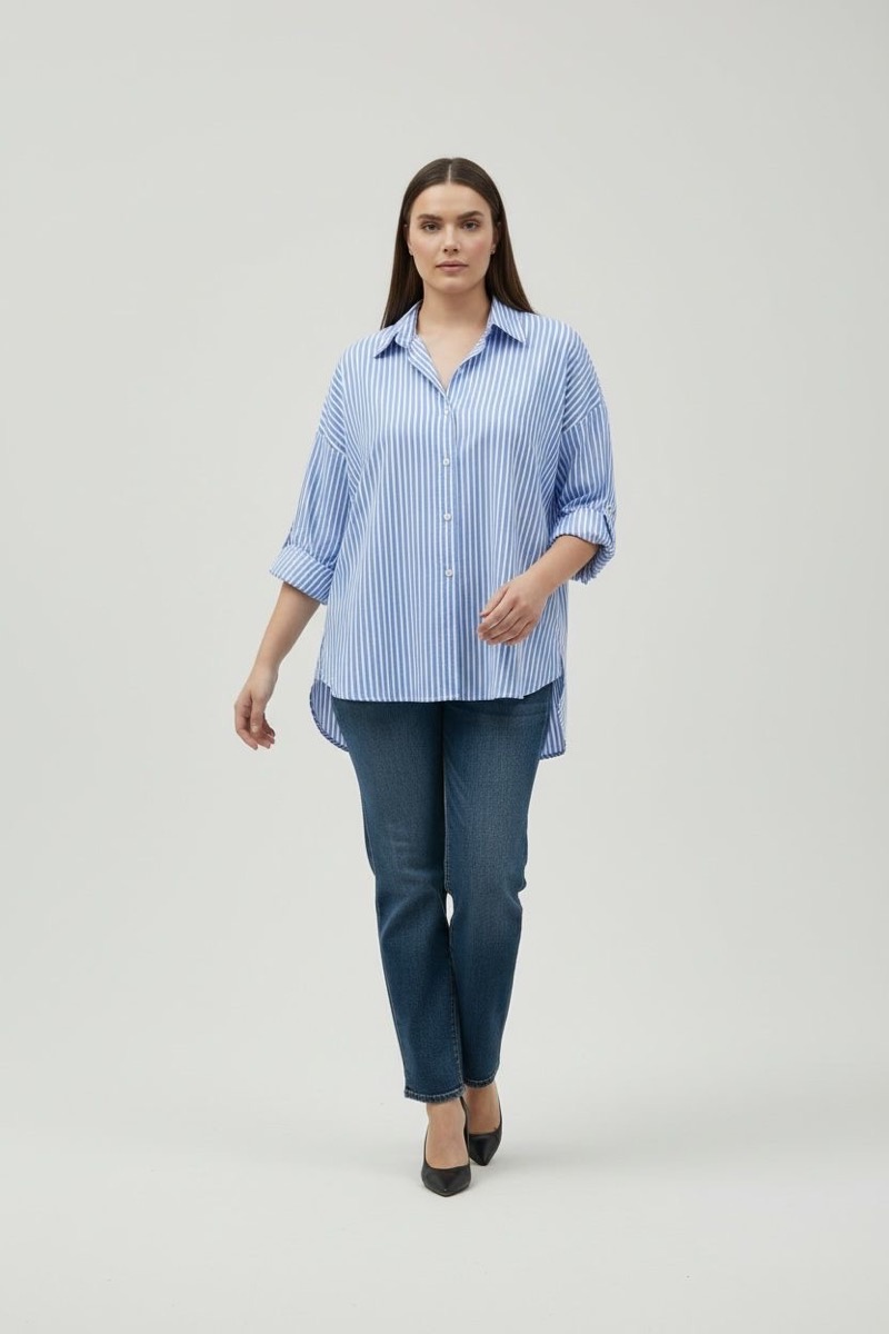 Cette chemise grande taille rayée est une pièce forte qui combine élégance intemporelle et touche mode contemporaine. Conçue pour sublimer les silhouettes généreuses, elle séduit par sa coupe ample et fluide, idéale pour un confort optimal tout en conservant une allure structurée. Son tissu à rayures fines bleu et blanc apporte une note chic et lumineuse, parfaite pour une garde-robe grande taille moderne.