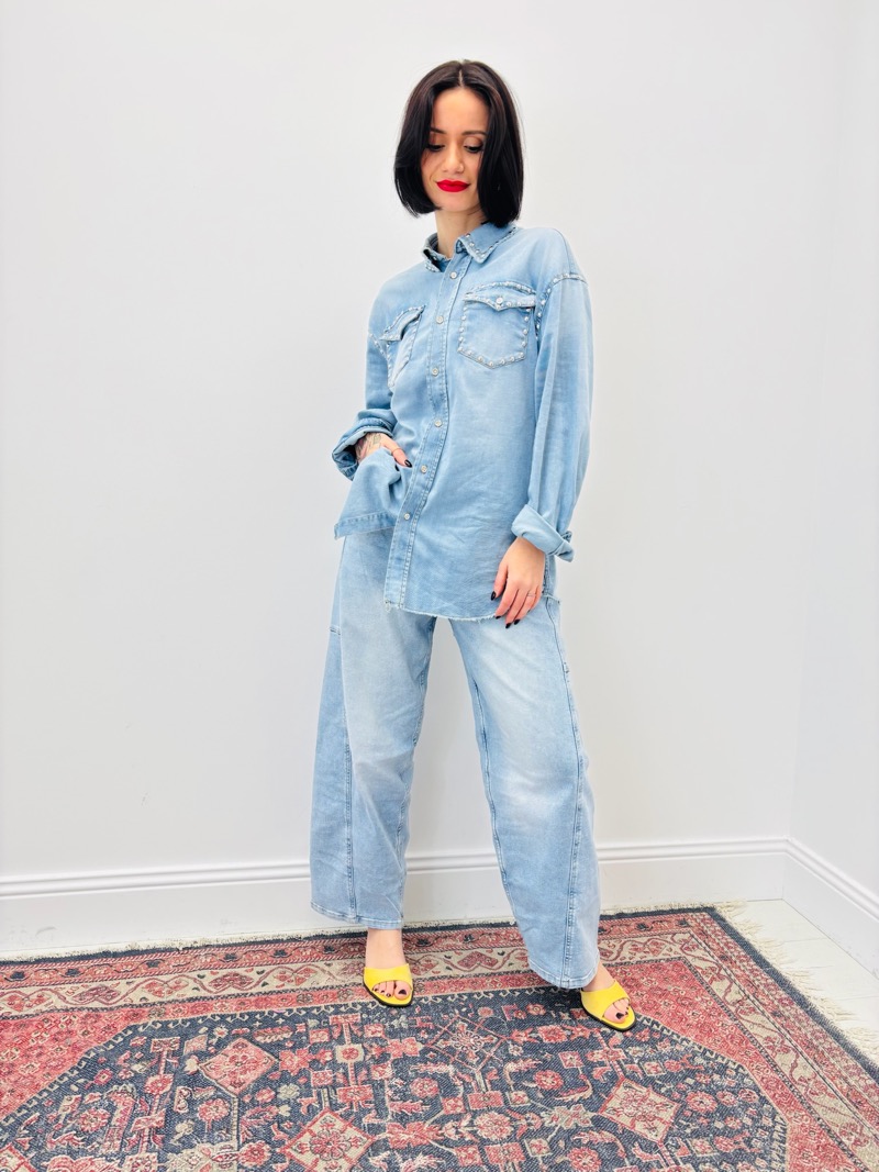 Le délavage bleu clair, doux et lumineux, donne un rendu casual chic facile à associer. Les empiècements discrets sur les jambes renforcent la ligne et ajoutent une touche moderne sans alourdir le design. Le denim est souple et agréable, permettant un porté confortable tout au long de la journée.