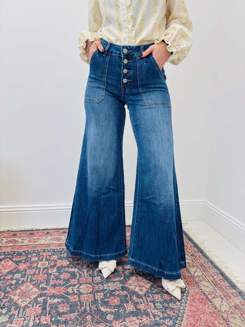 Ce jean coupe flared revisite l’esprit vintage avec une touche moderne et féminine. Sa taille haute met en valeur la silhouette tandis que sa jambe évasée allonge visuellement la ligne. Le boutonnage apparent à l’avant apporte du caractère et une finition mode très recherchée.
