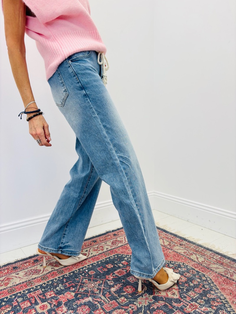 La taille haute structure la ligne et apporte un maintien agréable, tout en allongeant visuellement la jambe. Son délavage bleu subtil lui confère un aspect authentique et facile à associer, parfait pour traverser les saisons sans se démoder. Le détail signature de ce modèle réside dans son cordon en corde contrastée, qui apporte une touche casual chic et originale, tout en renforçant l’esprit moderne du jean.