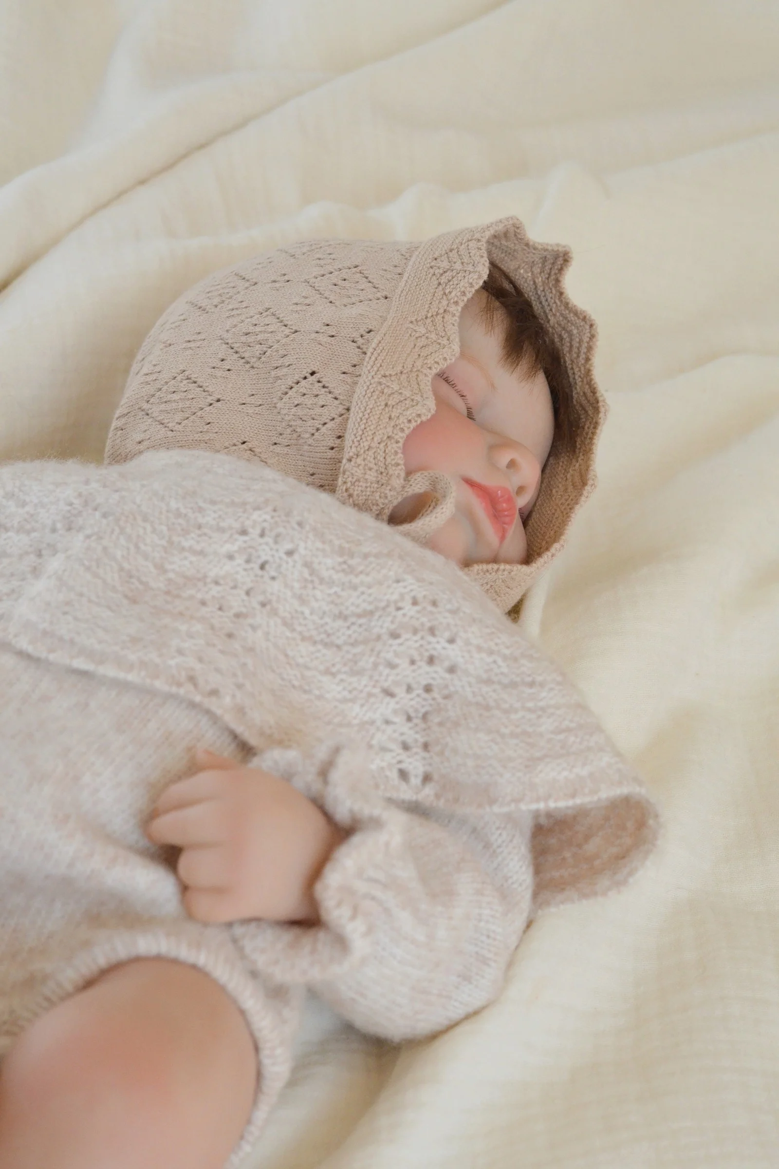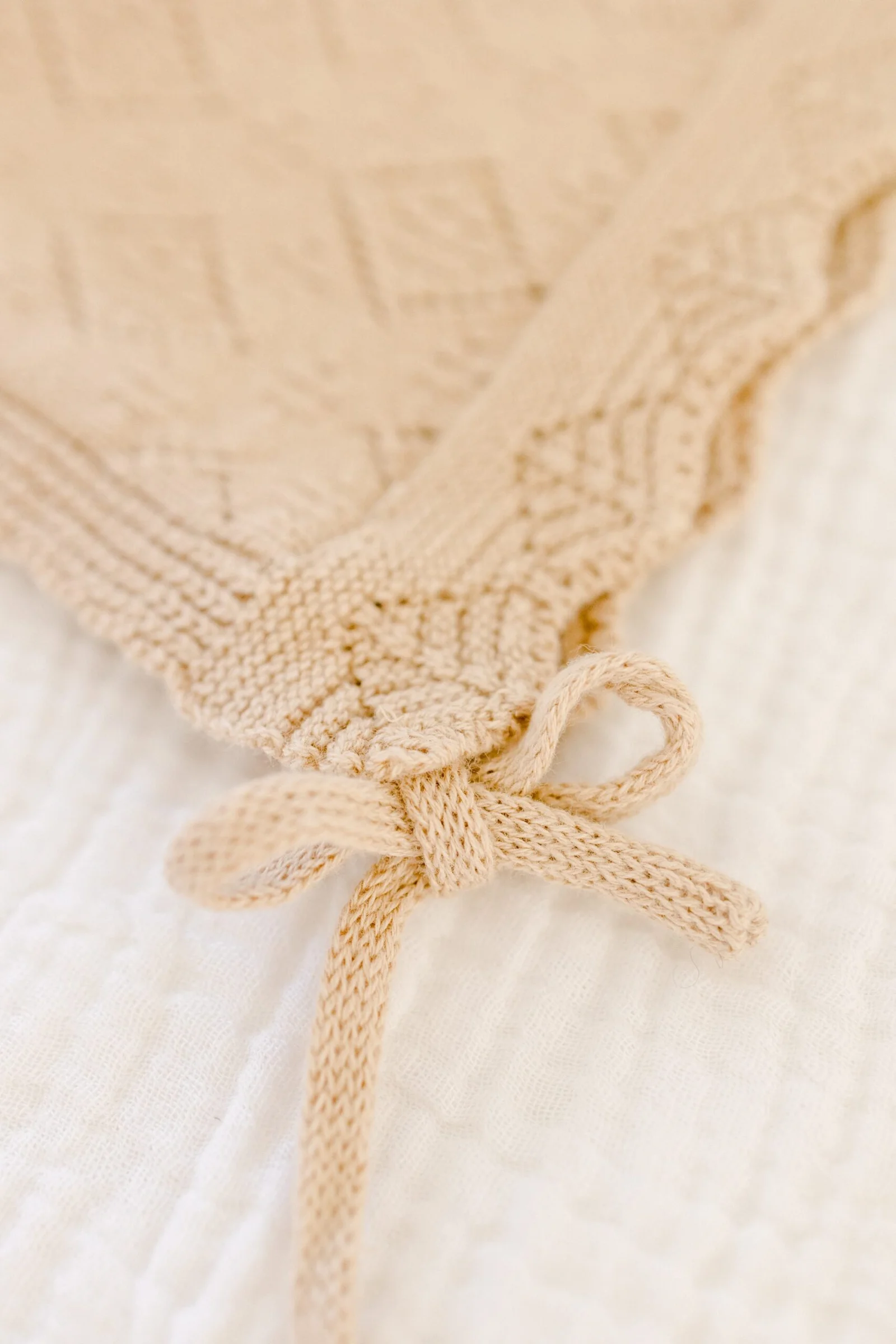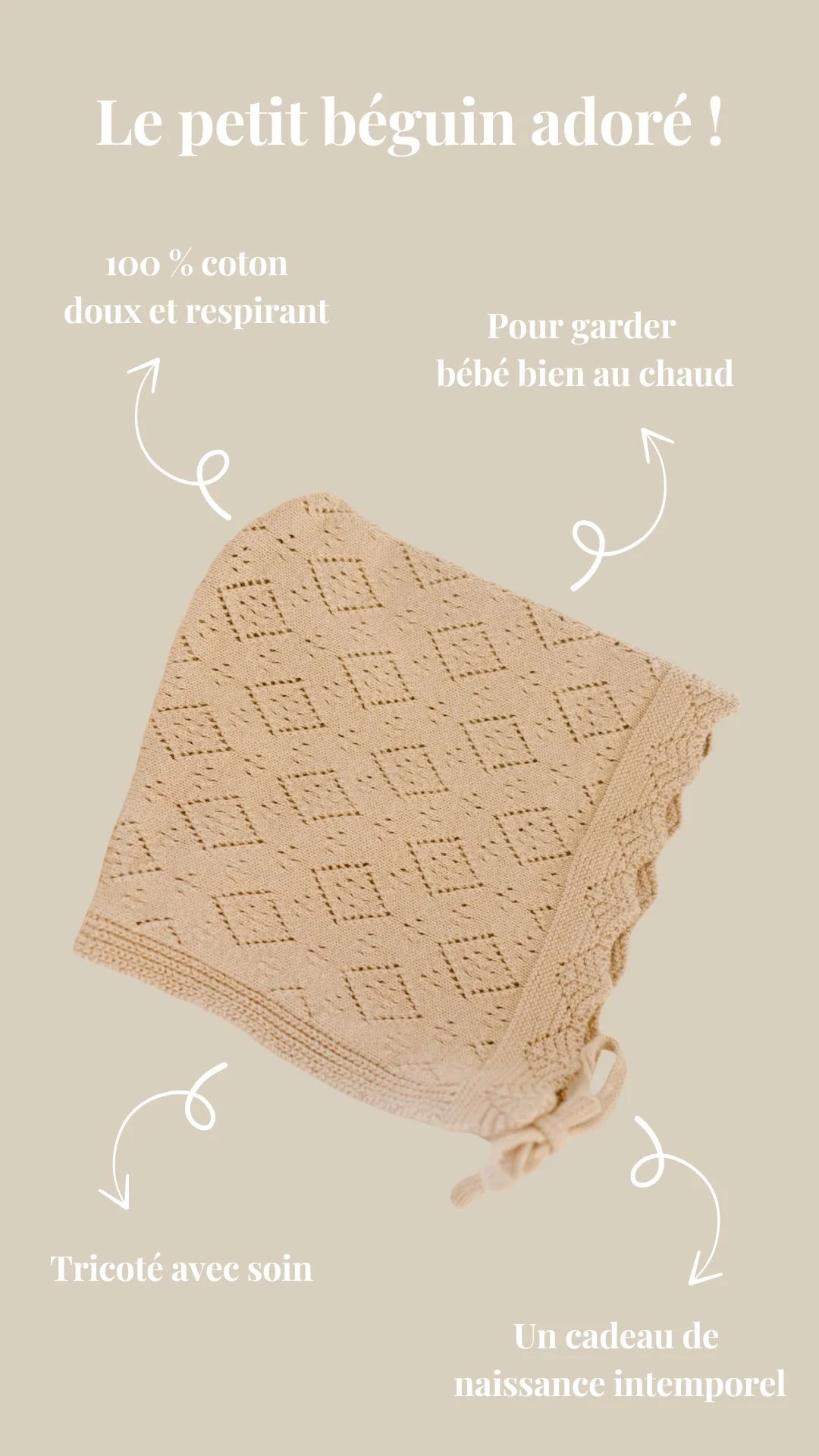 Mon petit béguin tricoté taupe 100% coton 0-6 mois BIENVENUE AU MONDE