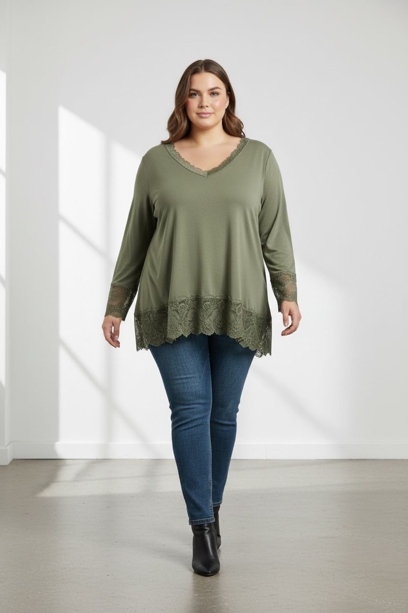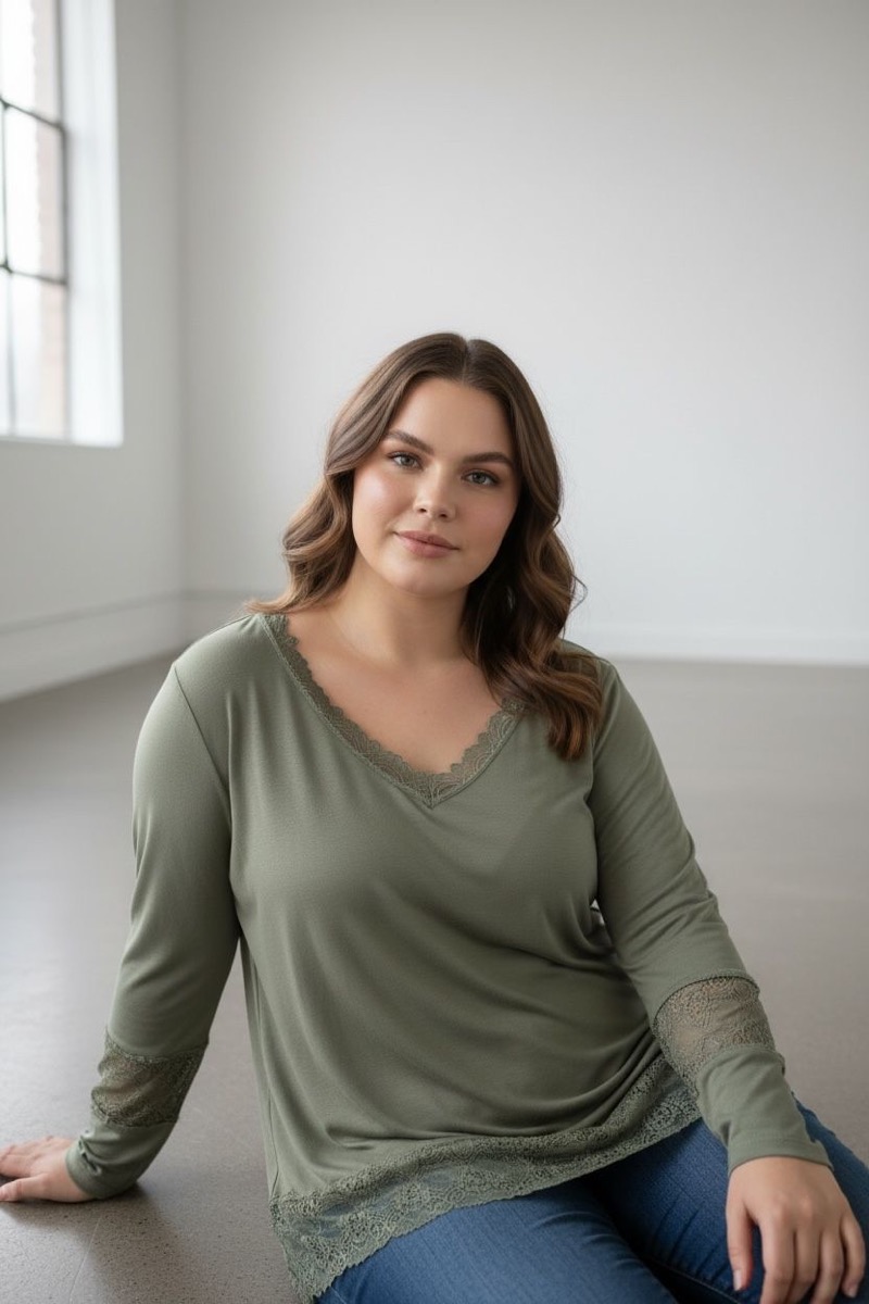 Ce sous-pull grande taille est une pièce incontournable pour composer des looks élégants et féminins en toute simplicité. Conçu dans une matière douce et fluide, il offre un tombé impeccable qui ne marque pas la silhouette. Son col V délicatement bordé de dentelle apporte une touche raffinée, tandis que la base et les poignets en dentelle renforcent l’effet chic et travaillé.