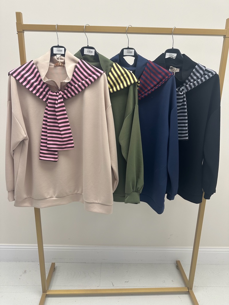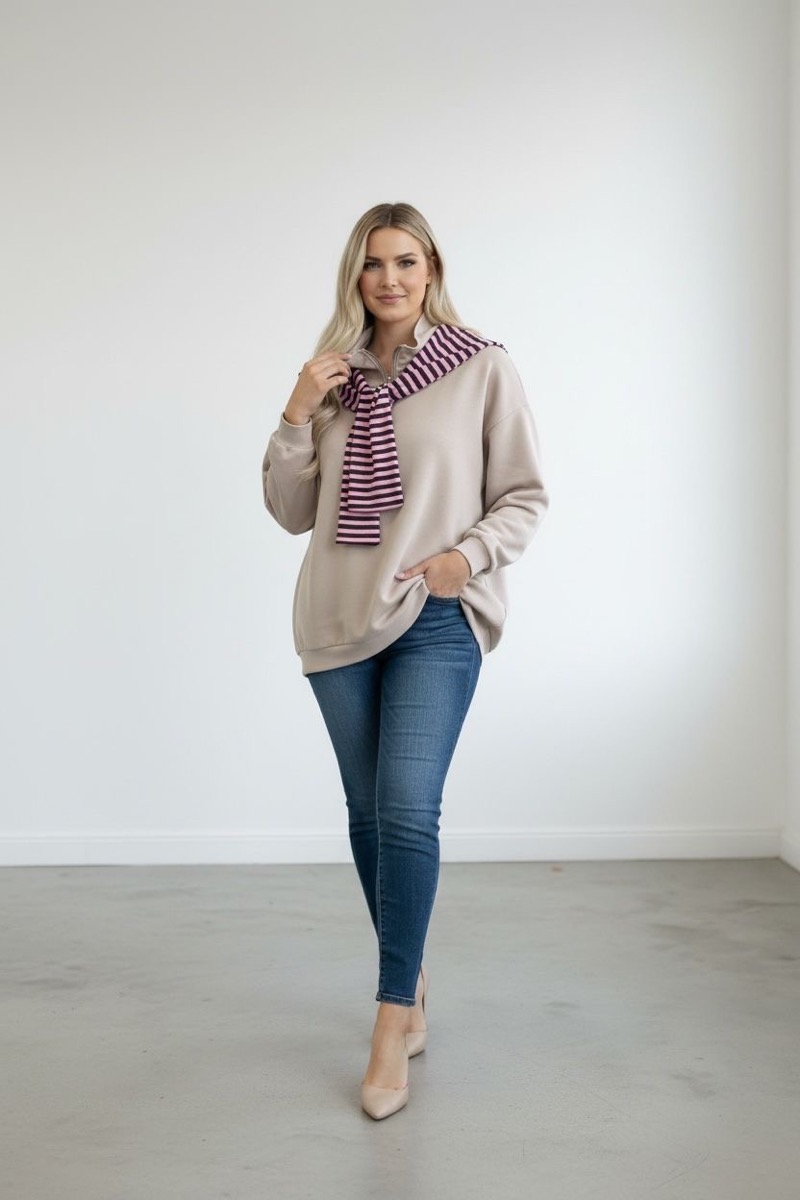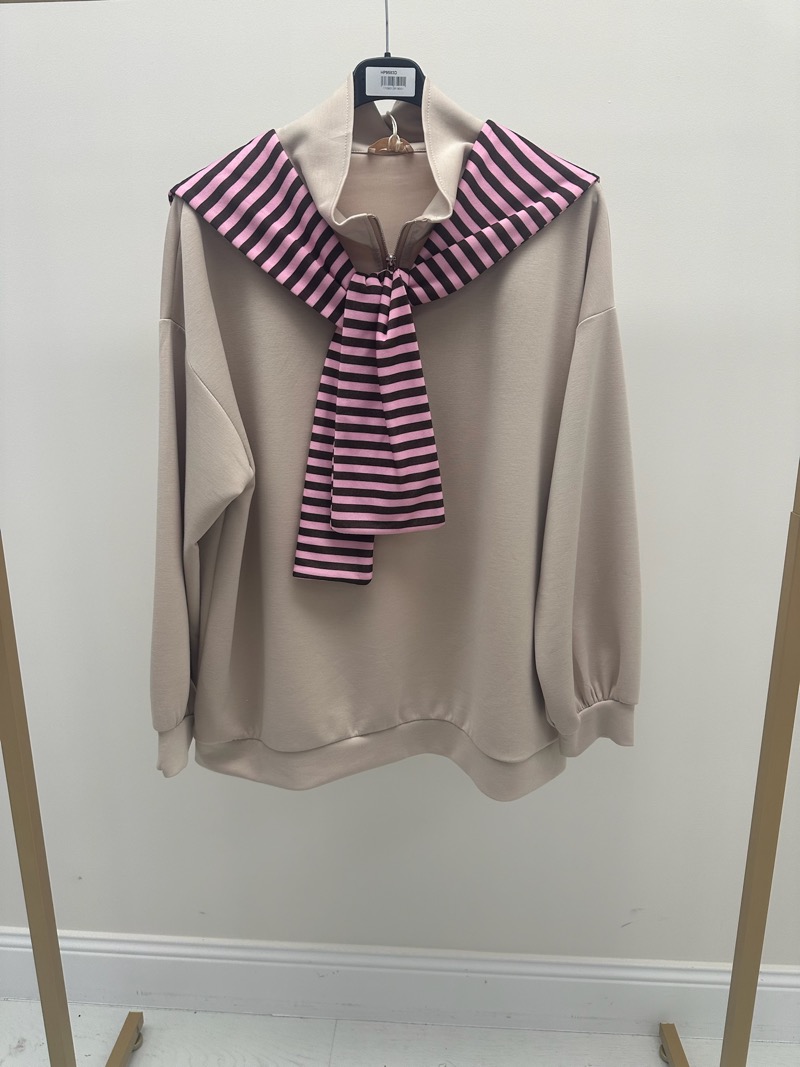 Le col montant zippé apporte une touche contemporaine et permet d’adapter le porté selon les envies : légèrement ouvert pour un style plus décontracté ou fermé pour une allure plus cocooning. Le détail foulard rayé, fixé au col, crée un contraste élégant avec la couleur douce et neutre du sweat. Il attire le regard vers le haut du buste et structure la tenue sans effort.