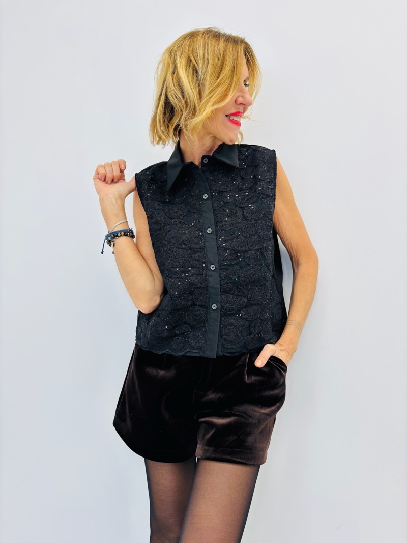 Ce top sans manches signé VOGUE est une pièce raffinée qui allie modernité et glamour. Le devant est entièrement travaillé en broderies circulaires rehaussées de sequins délicats, créant un effet lumineux subtil et très chic.