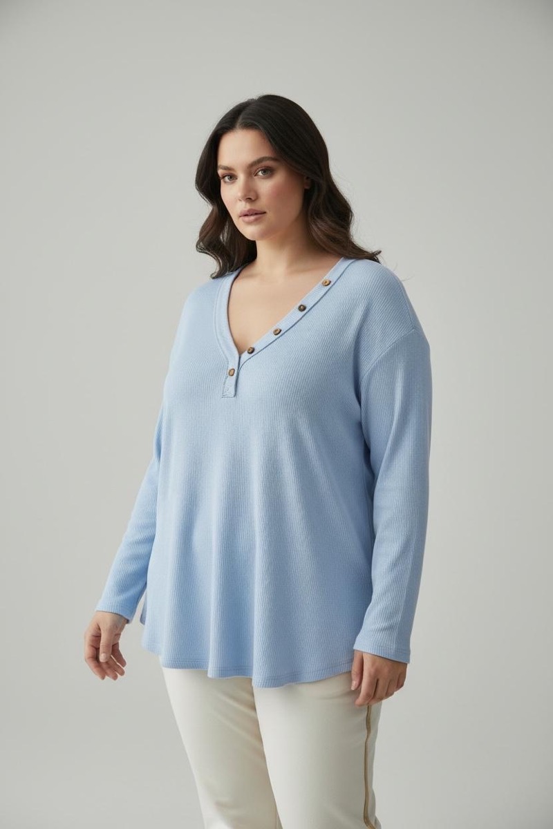 Tunique Grande Taille Bleu Ciel à Col Boutonné – Douceur & Élégance Quotidienne
