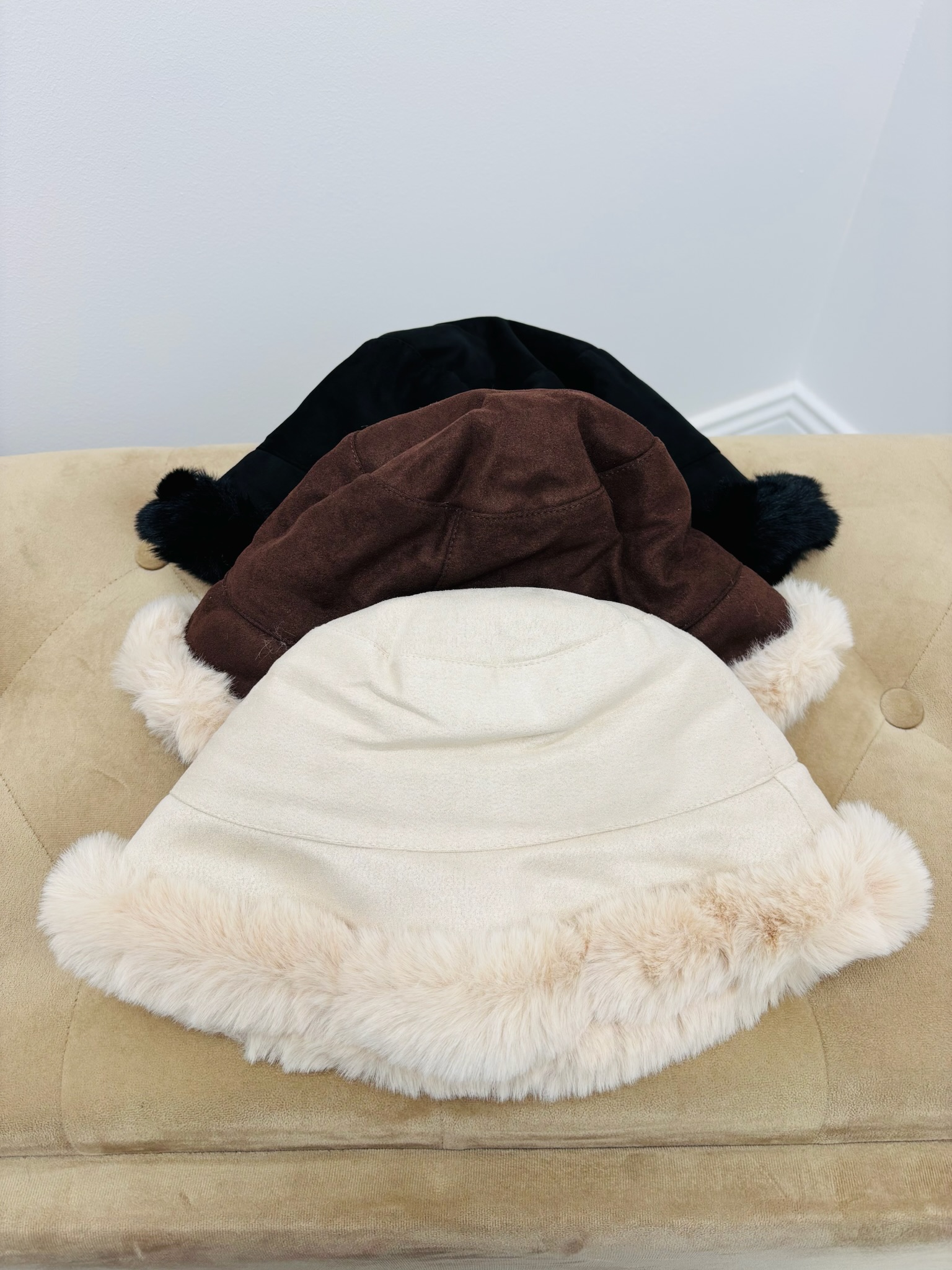 Ce bob en suédine lisse est bordé d’une fausse fourrure ultra douce qui encadre le visage avec élégance.