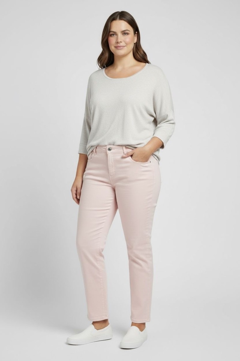 Sa taille intermédiaire à légèrement haute permet un excellent maintien au niveau du ventre, apportant un effet gainant discret et rassurant. La matière denim, enrichie en élasthanne, est souple, douce et extensible, ce qui rend ce jean très agréable à porter au quotidien, même sur de longues journées. Il épouse les hanches et les cuisses sans marquer, puis affine la jambe jusqu’à la cheville pour une silhouette élancée.