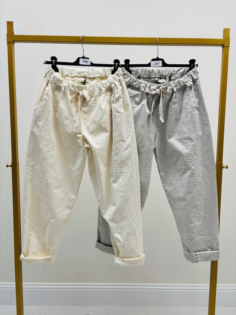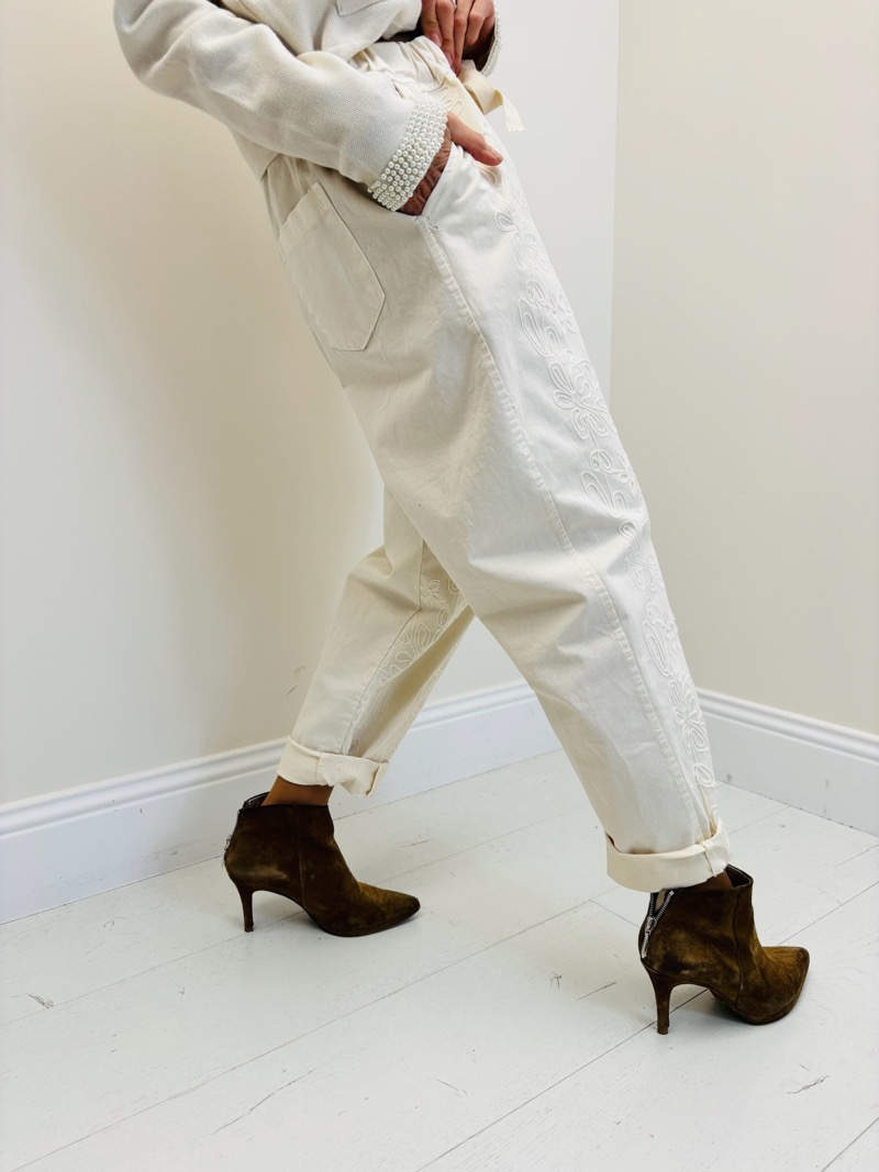 Le point fort de ce pantalon : ses broderies florales ton sur ton, travaillées avec finesse, qui apportent un charme unique et une identité forte à la pièce. La taille élastiquée avec lien à nouer garantit un maintien parfait tout en s’adaptant à toutes les morphologies. Revers au bas possible pour jouer avec le style et les longueurs.