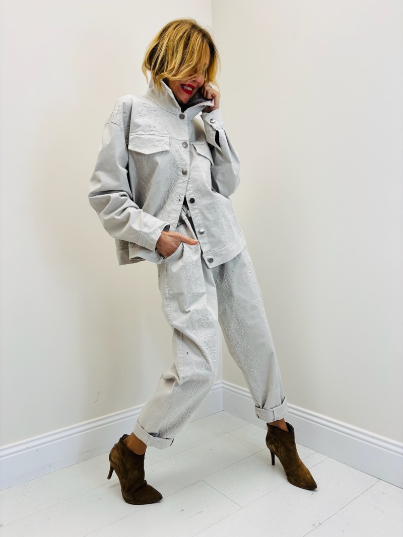 Ce pantalon brodé d’inspiration italienne revisite le style casual avec une touche sophistiquée. Sa coupe barrel, légèrement arrondie et resserrée vers le bas, lui donne une silhouette moderne et confortable. Confectionné majoritairement en coton, il offre douceur, respirabilité et un tombé naturel très agréable au quotidien.