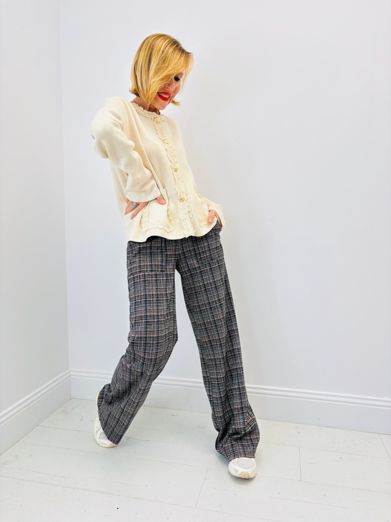 Le pantalon carreaux EMA BLUES est une pièce incontournable pour celles qui aiment les silhouettes confortables sans sacrifier le style.