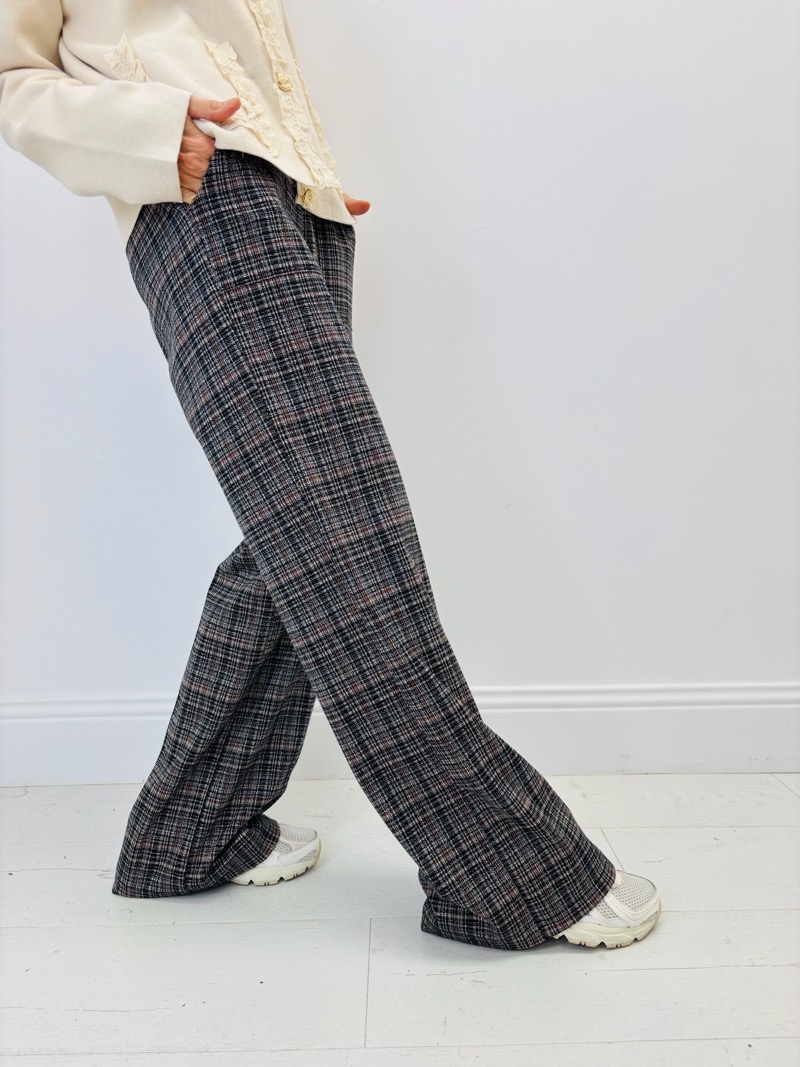 La fluidité du pantalon apporte du mouvement à la silhouette, tandis que le motif carreaux structure l’ensemble.
