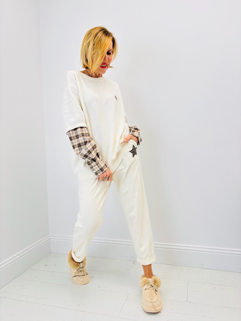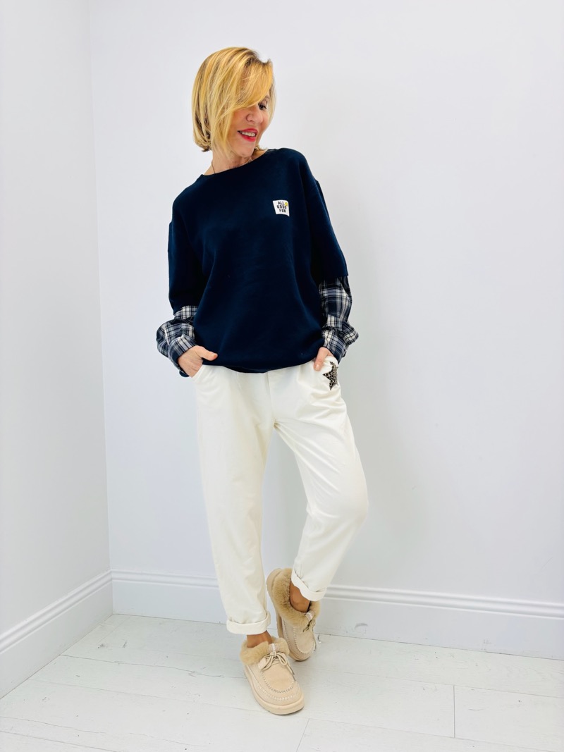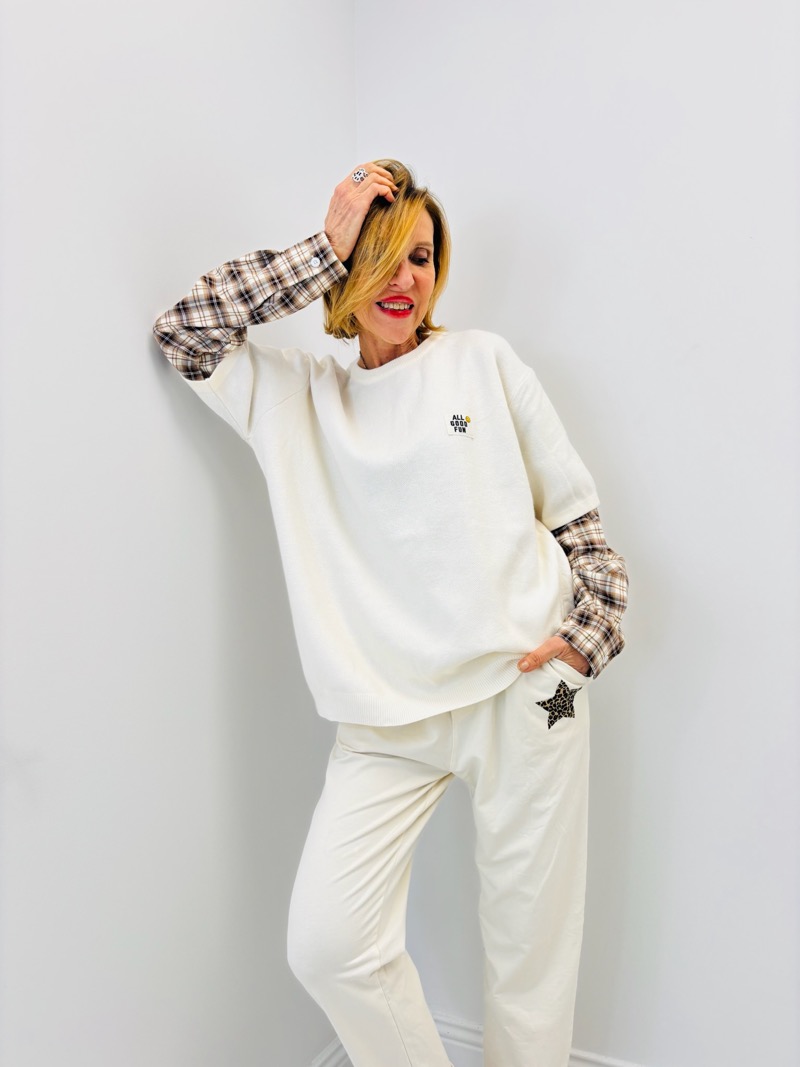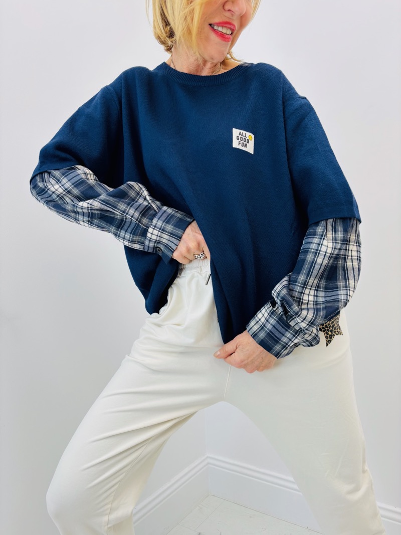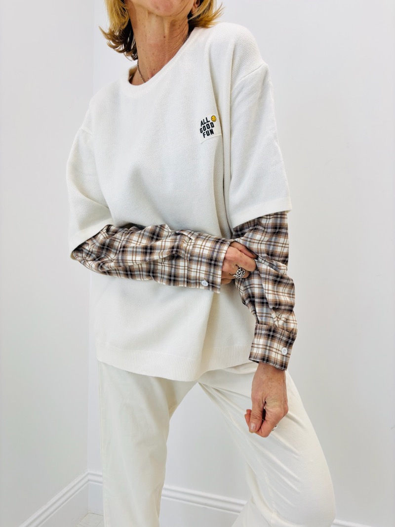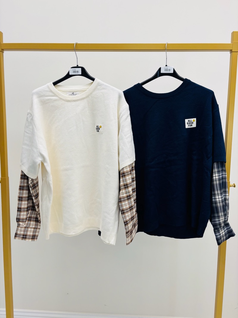Le détail phare de ce modèle réside dans ses manches façon chemise à carreaux, qui dépassent subtilement du pull pour créer un contraste élégant et très mode. Elles donnent l’illusion d’un layering parfaitement maîtrisé, sans superposition réelle. Le col rond classique équilibre l’ensemble, tandis que la petite broderie/patch discret sur la poitrine ajoute une touche casual moderne.