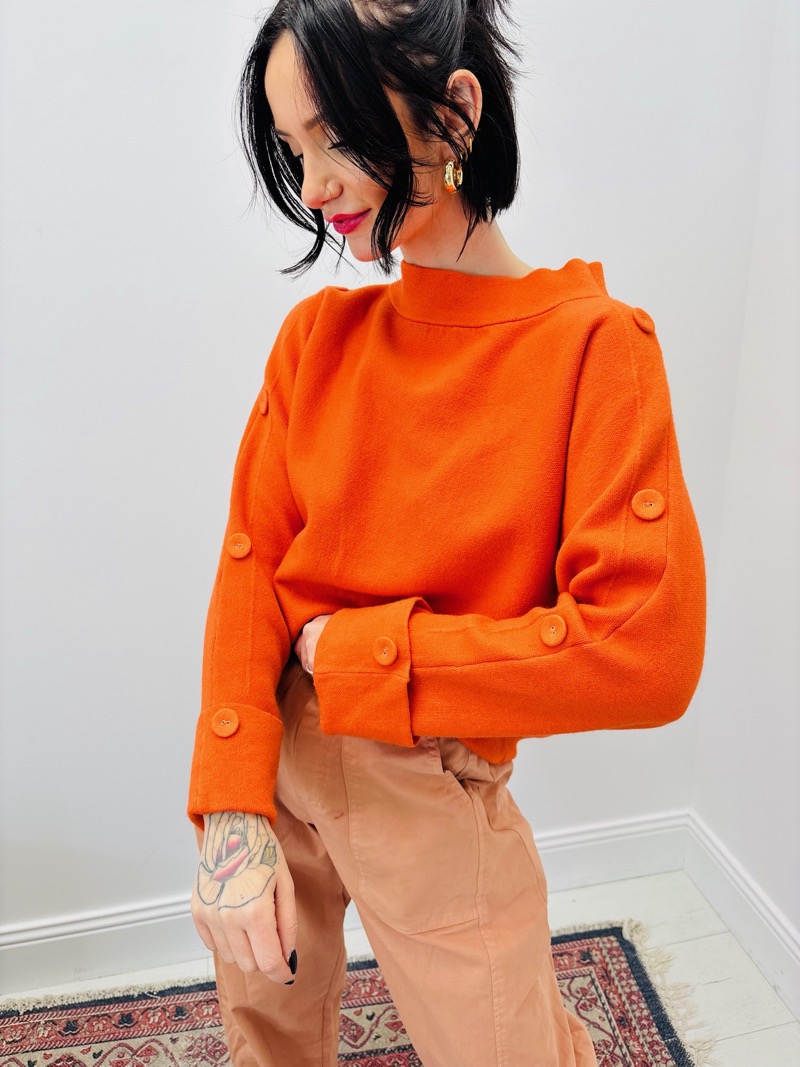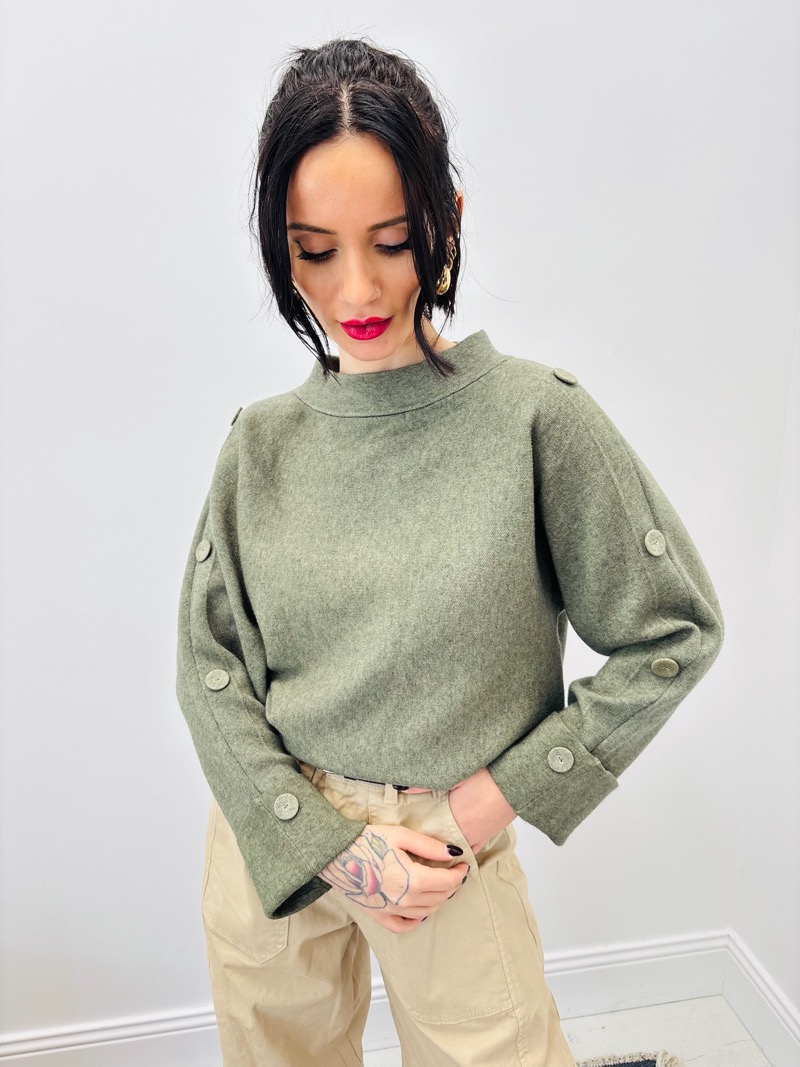 Les boutons décoratifs placés sur les épaules et le long des manches sont la signature de ce modèle. Ils ajoutent une dimension mode et raffinée, tout en rappelant les codes du prêt-à-porter haut de gamme. Les manches longues présentent un léger volume, avec une coupe confortable qui assure une liberté de mouvement optimale.
