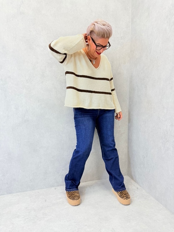 Un pull tendance au look marin revisité, parfait pour la mi-saison et l’hiver. Facile à associer avec un jean brut, un pantalon blanc ou une jupe pour une allure chic et décontractée.