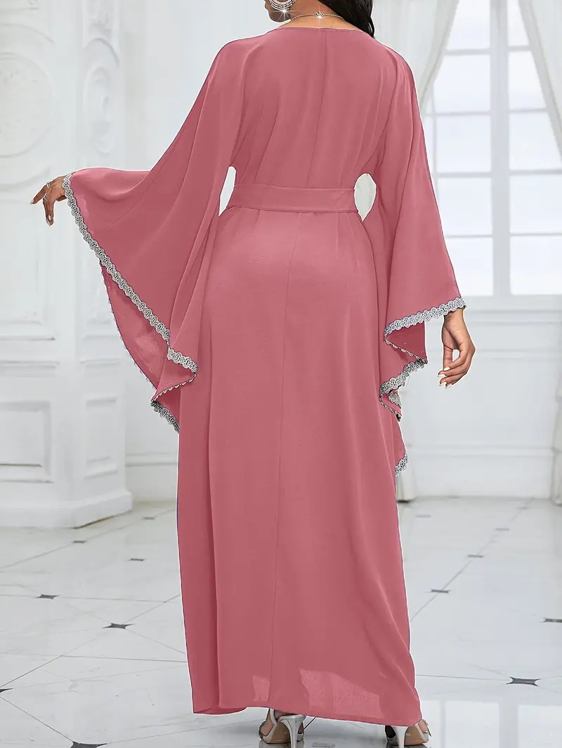 Robe Élégante à Manches Évasées – Dentelle Contrastée & Taille Nouée (Rose)